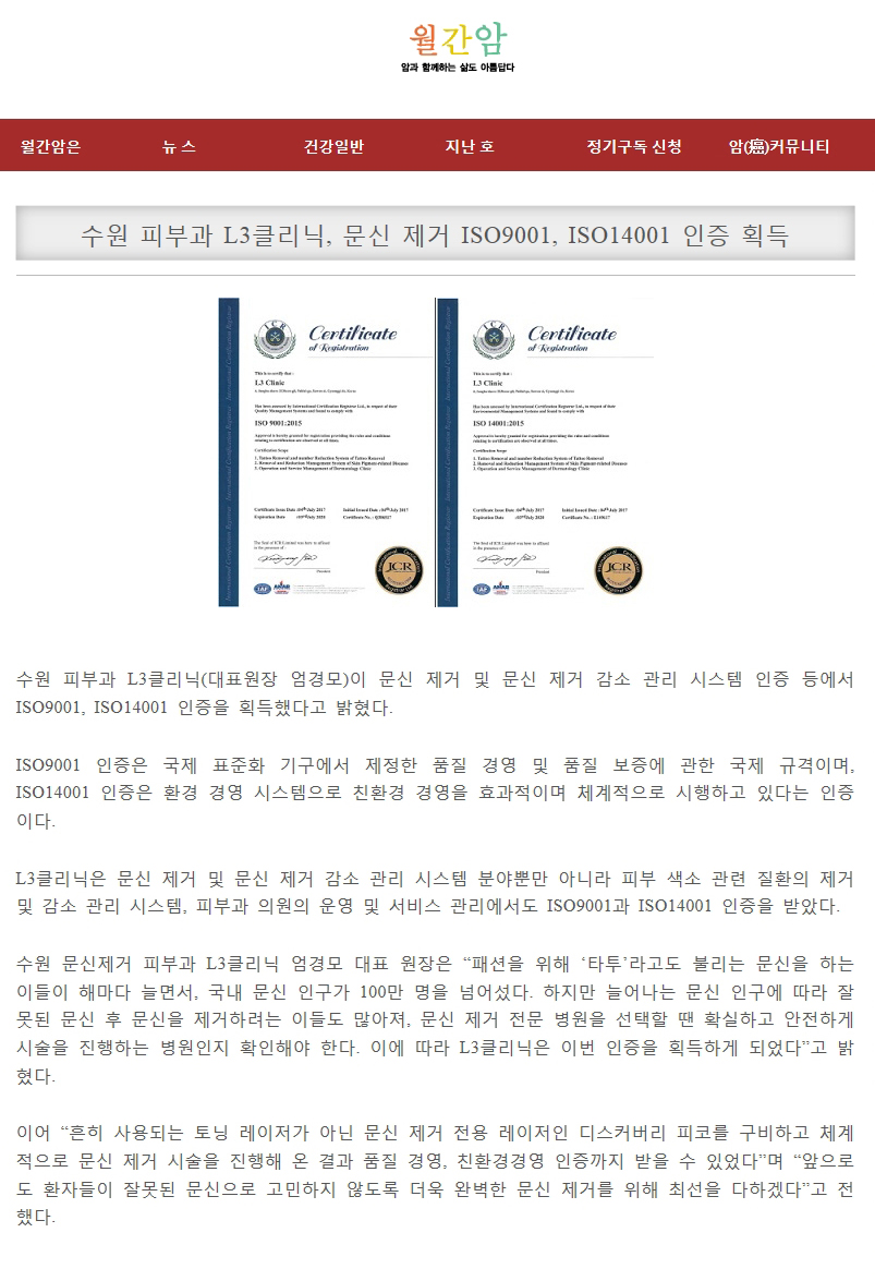[월간암] 문신제거 국제 인증 획득